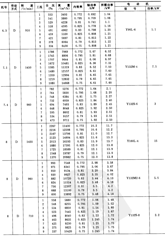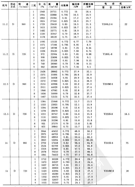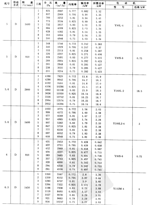 1)本風(fēng)機(jī)為單吸入風(fēng)機(jī),機(jī)號(hào)有No.3.15、3.55、4、4.5、5、5.6、6.3、7.1、8、9、10、11.2、12.5、14等共14個(gè)機(jī)號(hào)組成。